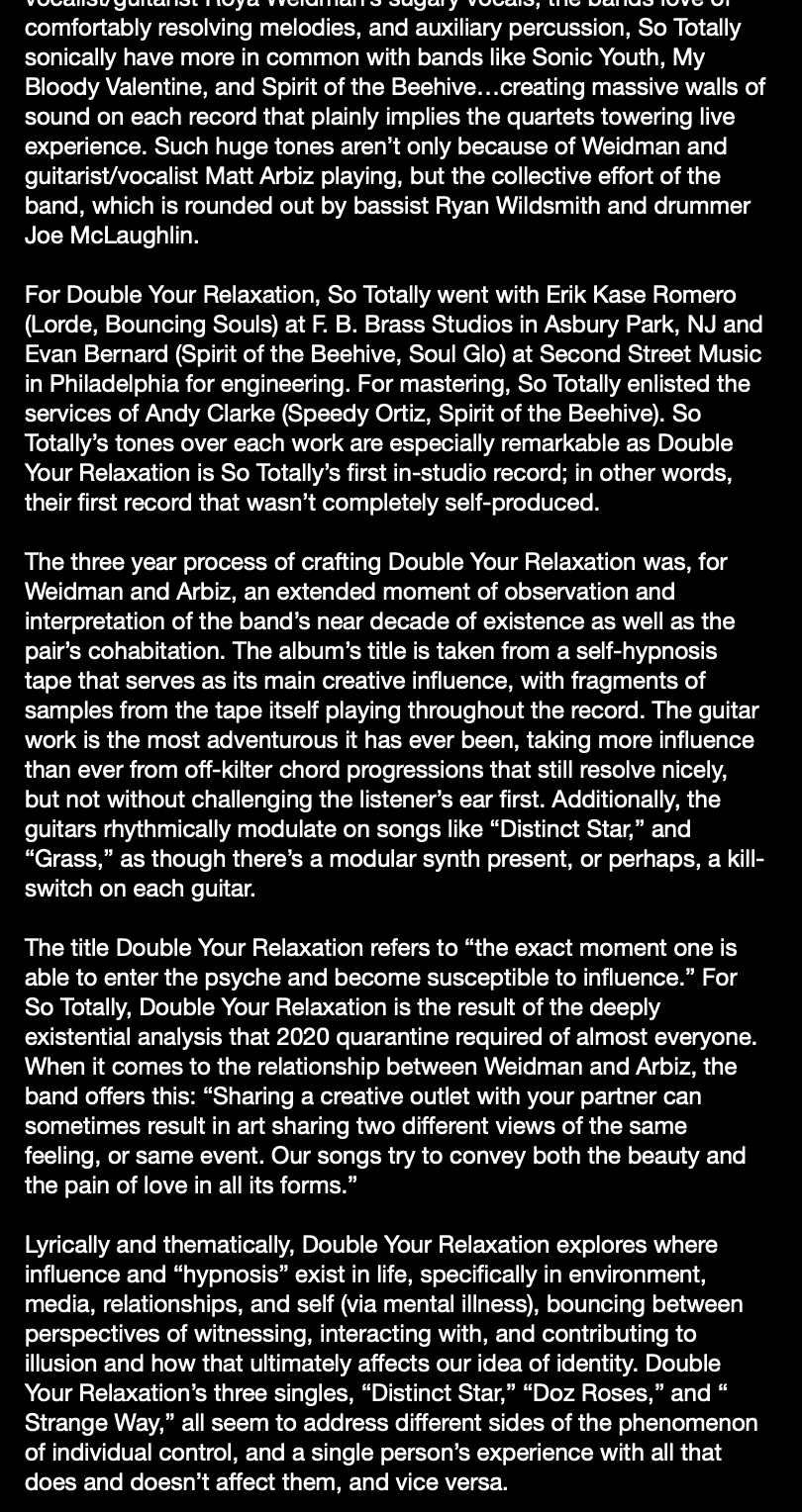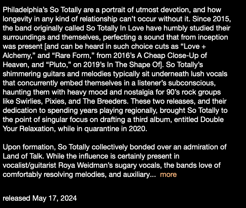 Because I value your time, I won’t paste a later 76-word anaconda of a sentence waiting to slowly strangle you with comma splices. Just know that the bio concludes like a book report, noting the songs lend themselves “very appropriately” to the shoegaze and “heavy indie” (??) favored by So Totally, “making them a perfect addition to the canon of the genre.”