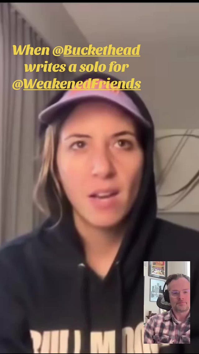 And Sonia Sturino of Weakened Friends talking about her unlikely friendship with Buckethead! DO I PLEASE YOU NOW, ALGORITHM? SHINE YOUR FAVOR UPON ME!